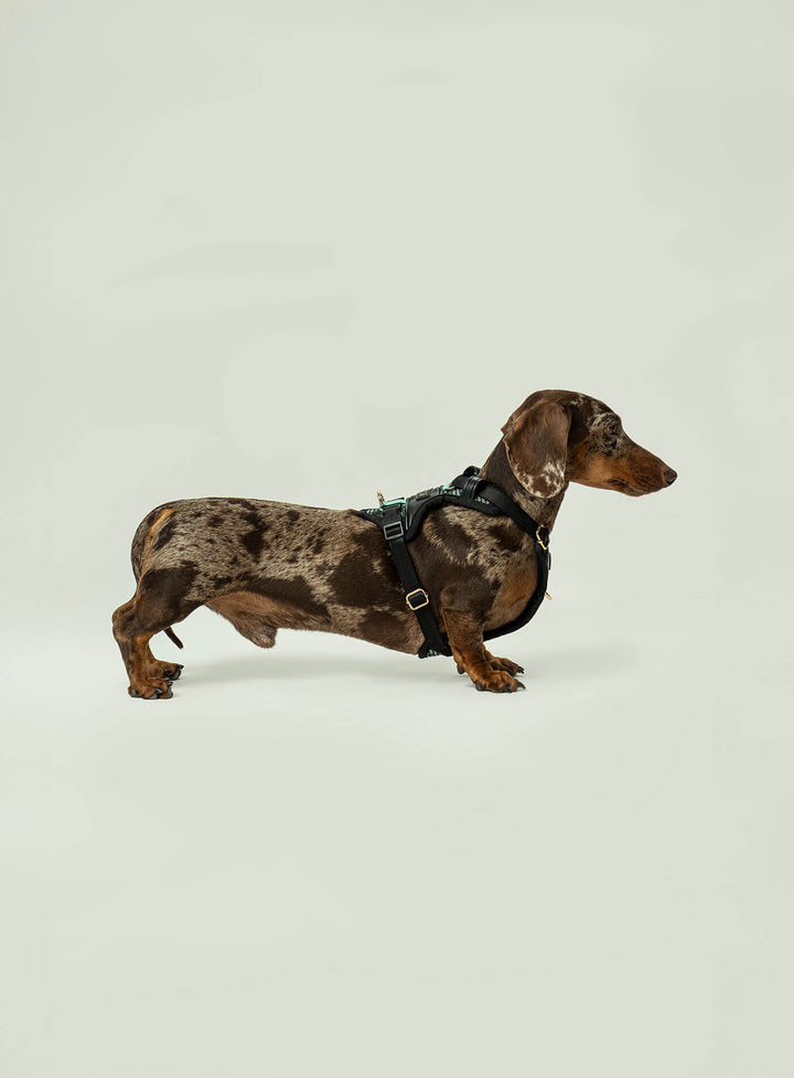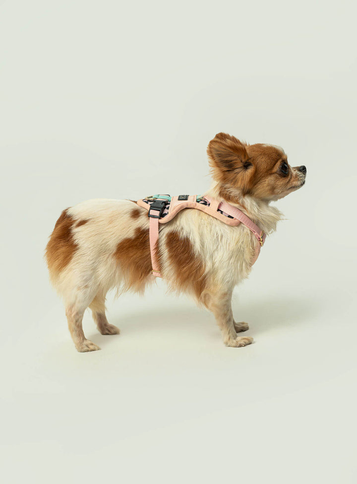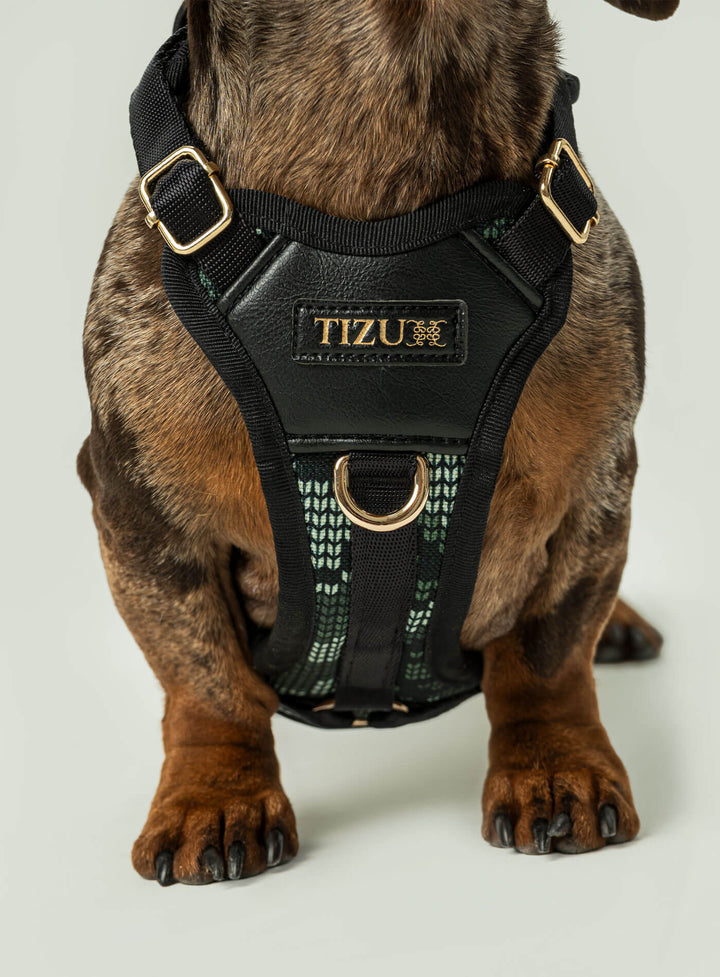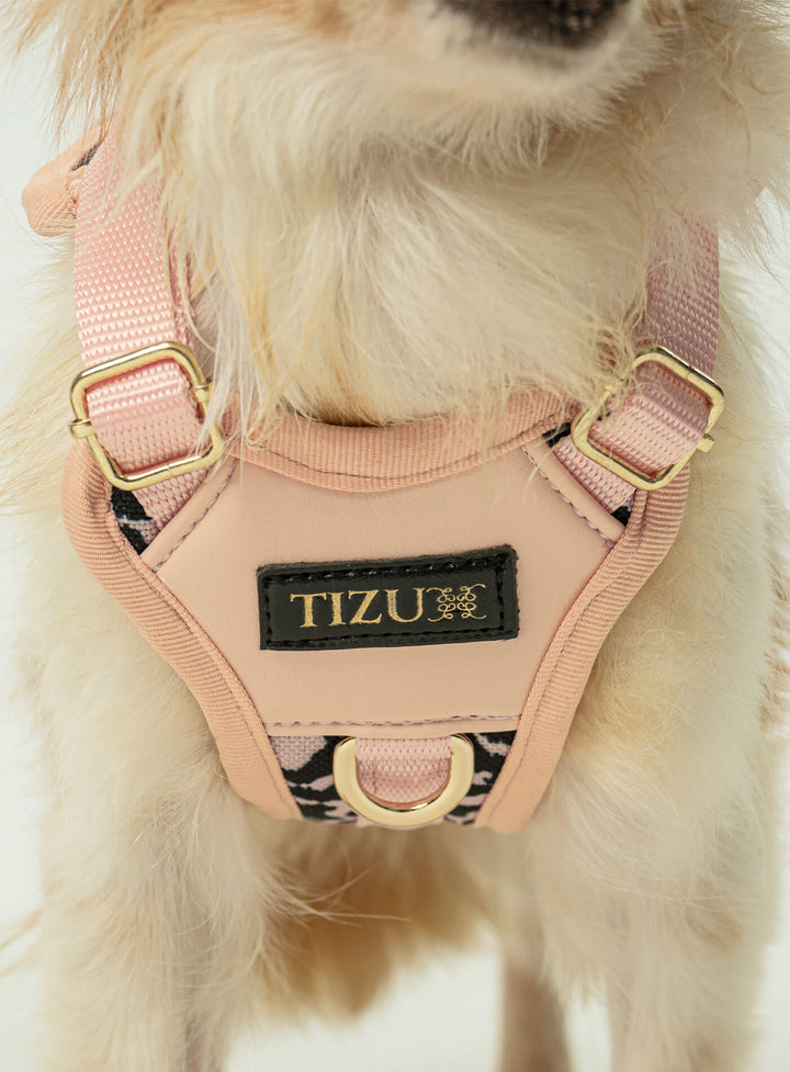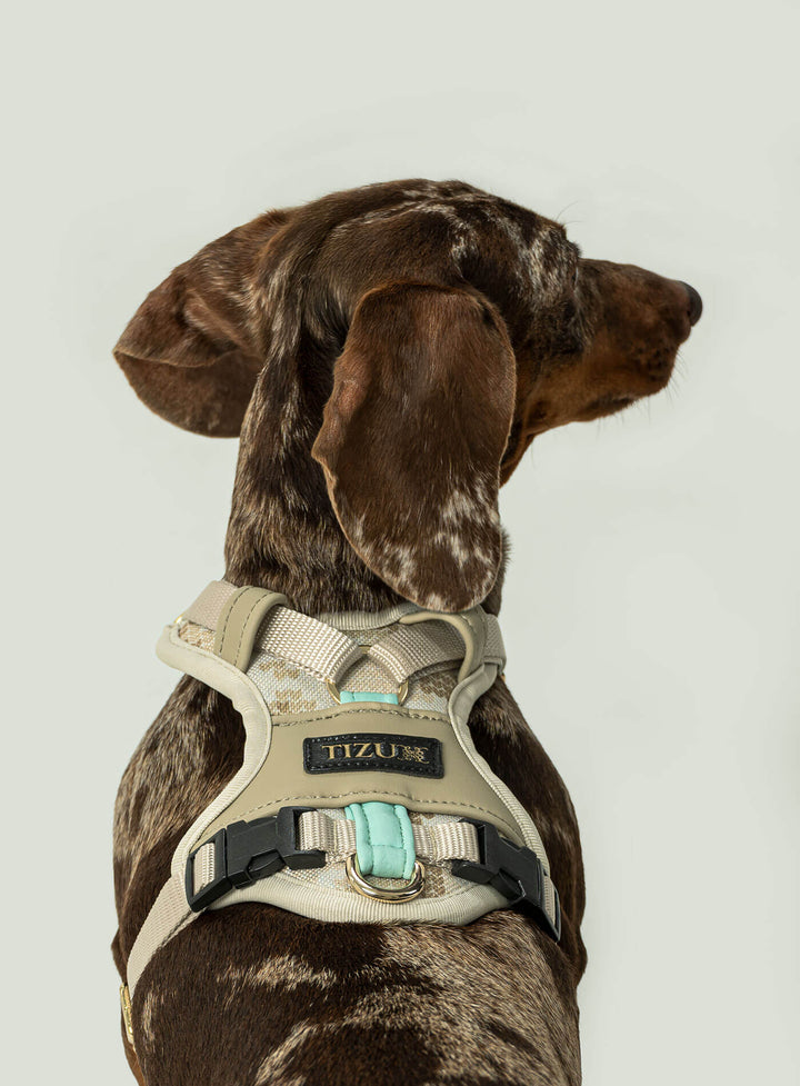 Corso inspirado en las pieles de los animales que habitan en climas cálidos como reptiles y felinos, tomando los patrones propios de su aspecto para traerlos a esta pieza artesanal y bella que está construida a base de tela tipo lona y reatas para brindar mayor resistencia y seguridad.