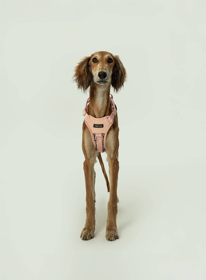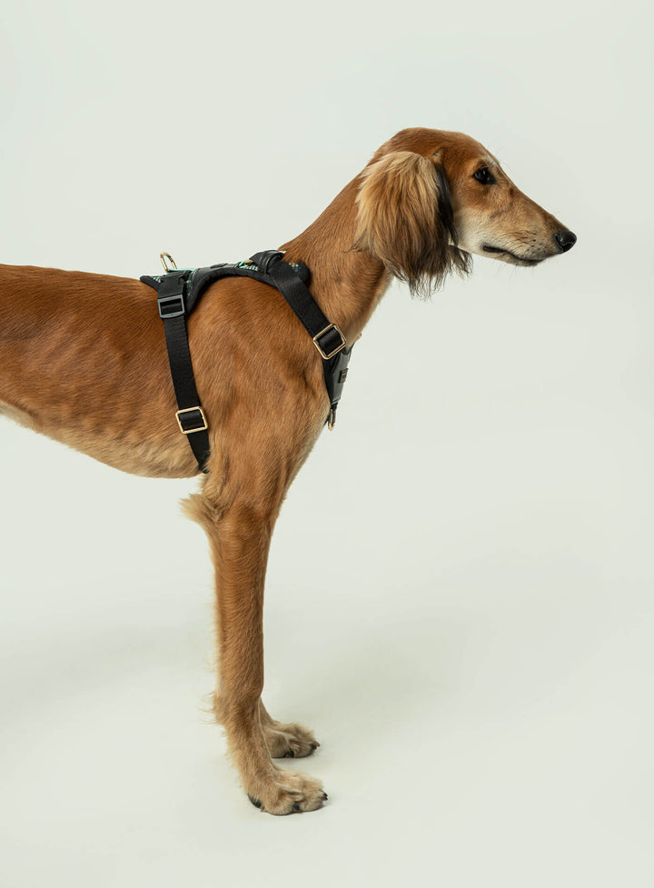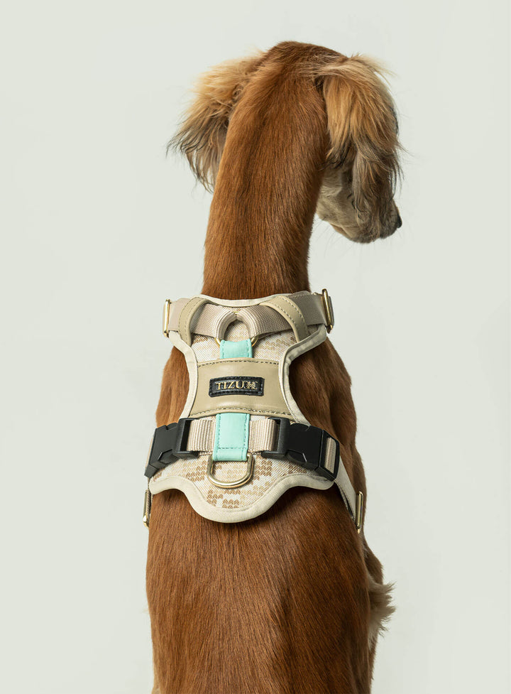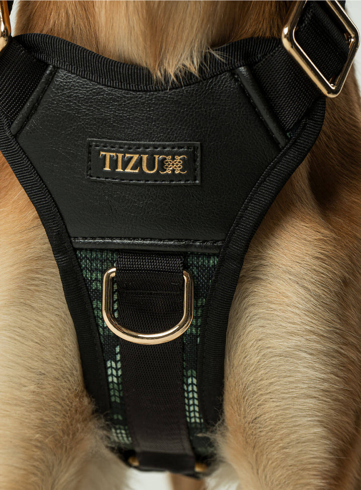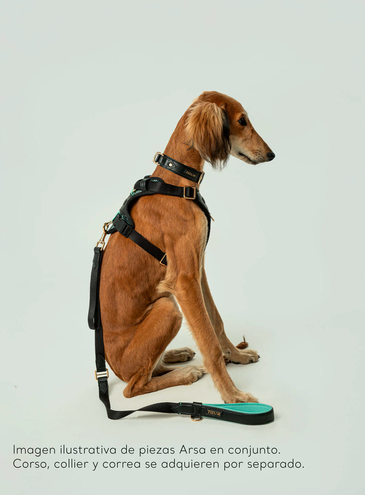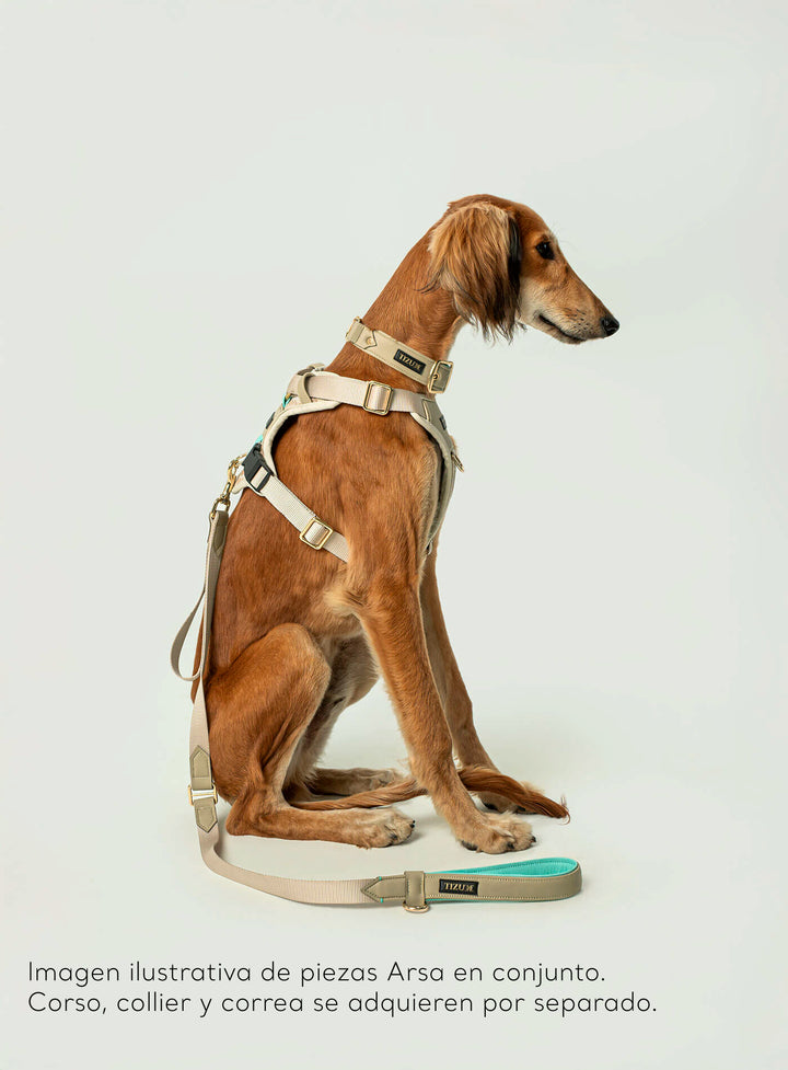 Corso inspirado en las pieles de los animales que habitan en climas cálidos como reptiles y felinos, tomando los patrones propios de su aspecto para traerlos a esta pieza artesanal y bella que está construida a base de tela tipo lona y reatas para brindar mayor resistencia y seguridad.