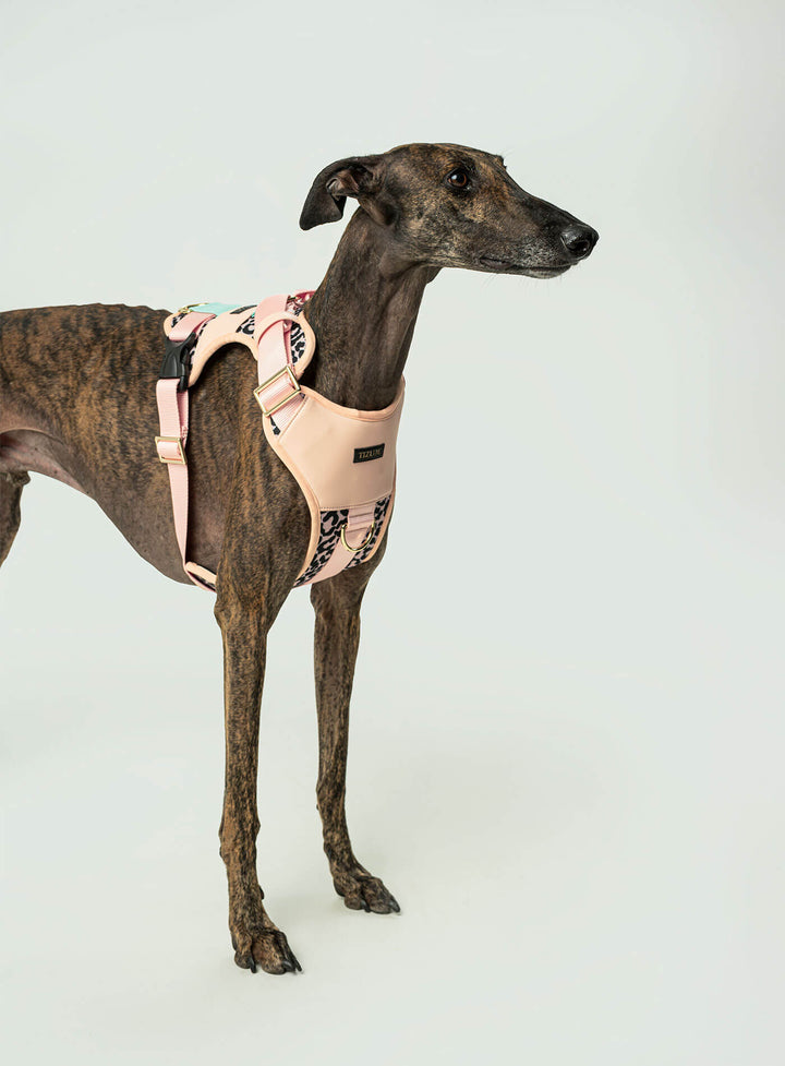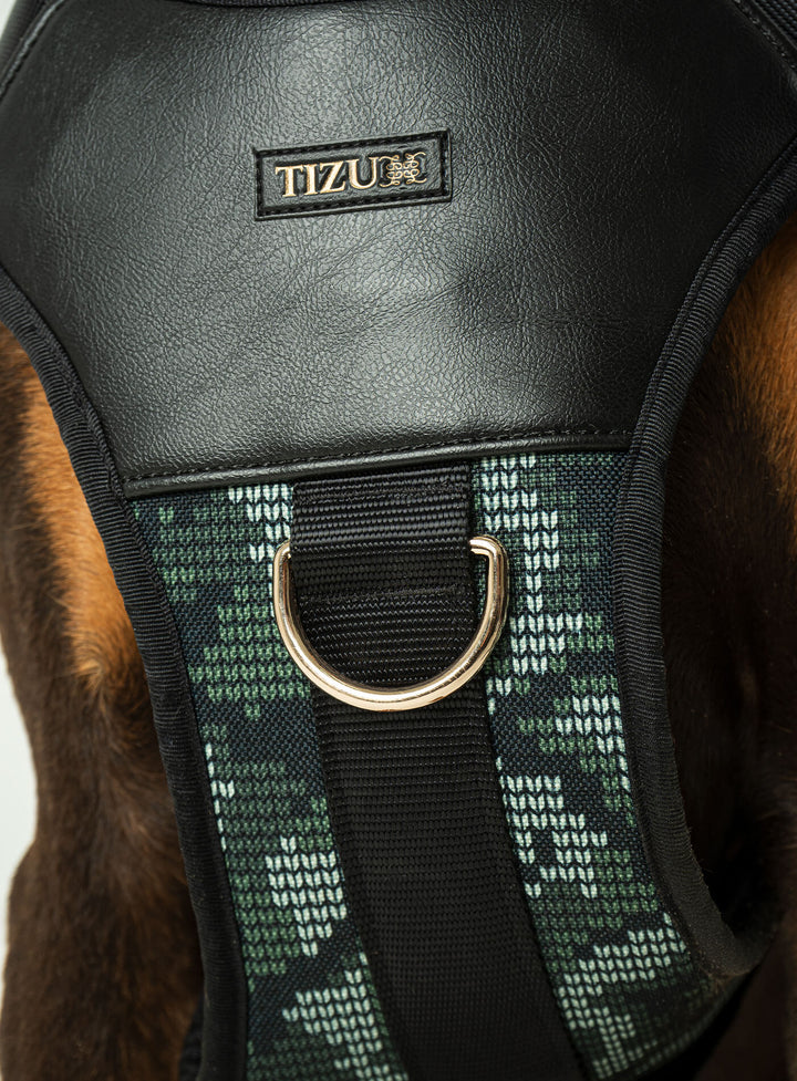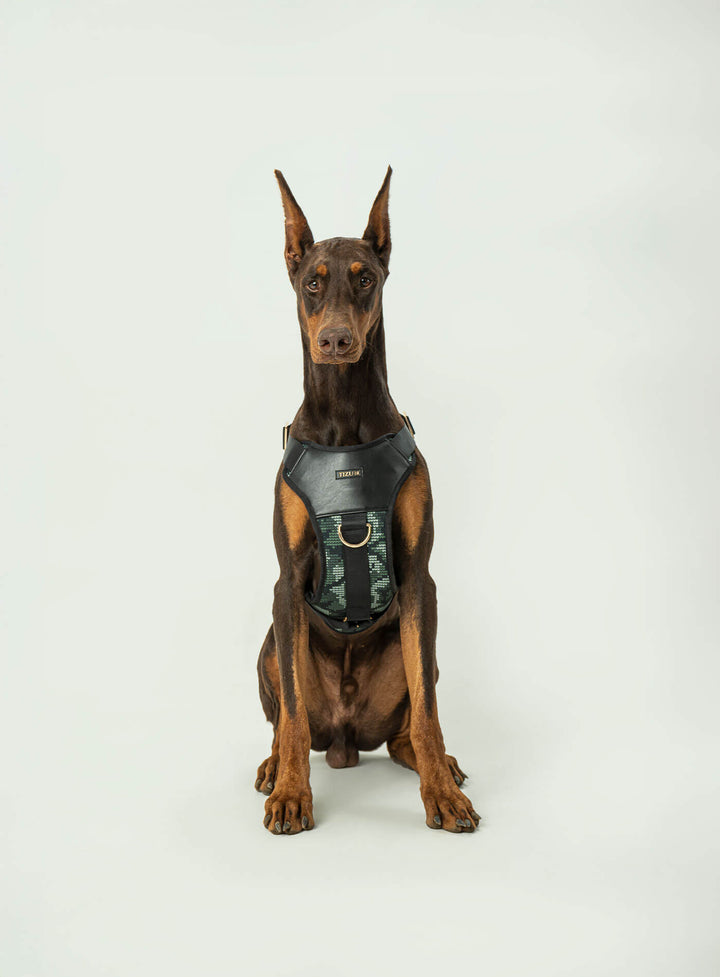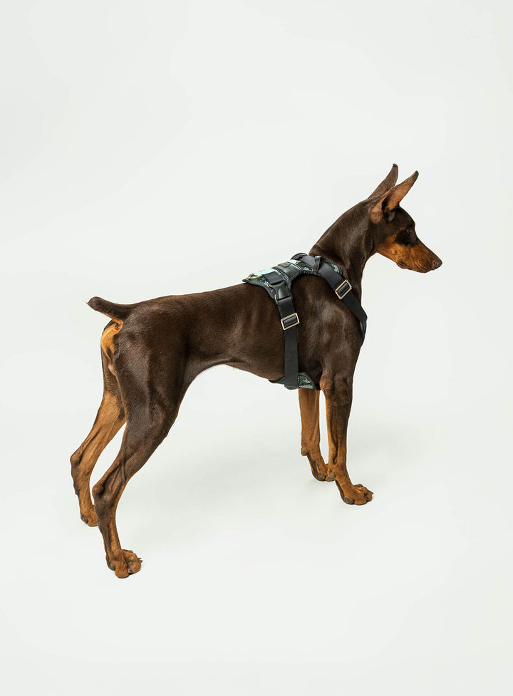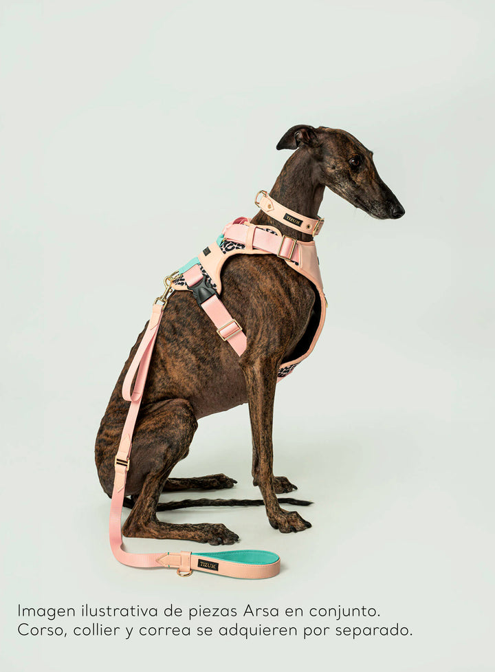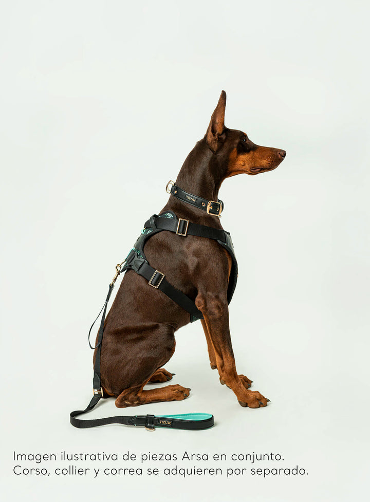 Corso inspirado en las pieles de los animales que habitan en climas cálidos como reptiles y felinos, tomando los patrones propios de su aspecto para traerlos a esta pieza artesanal y bella que está construida a base de tela tipo lona y reatas para brindar mayor resistencia y seguridad.